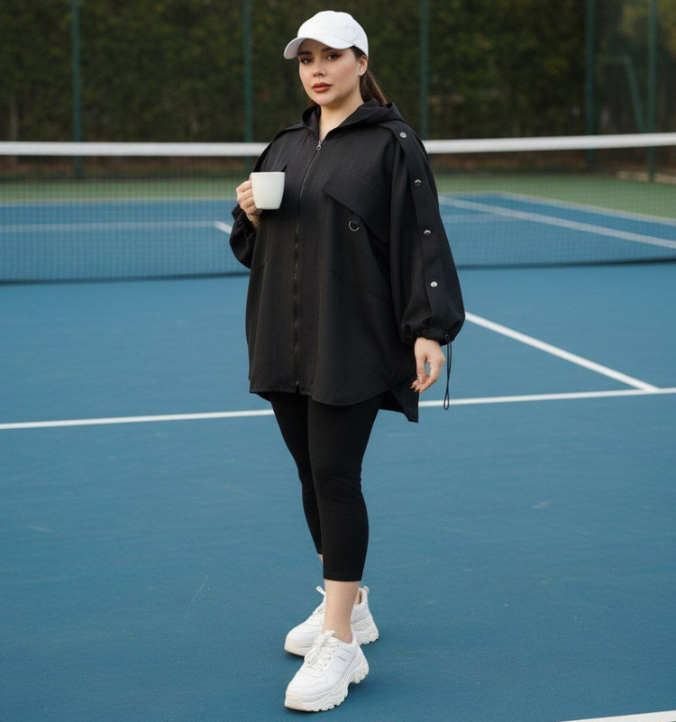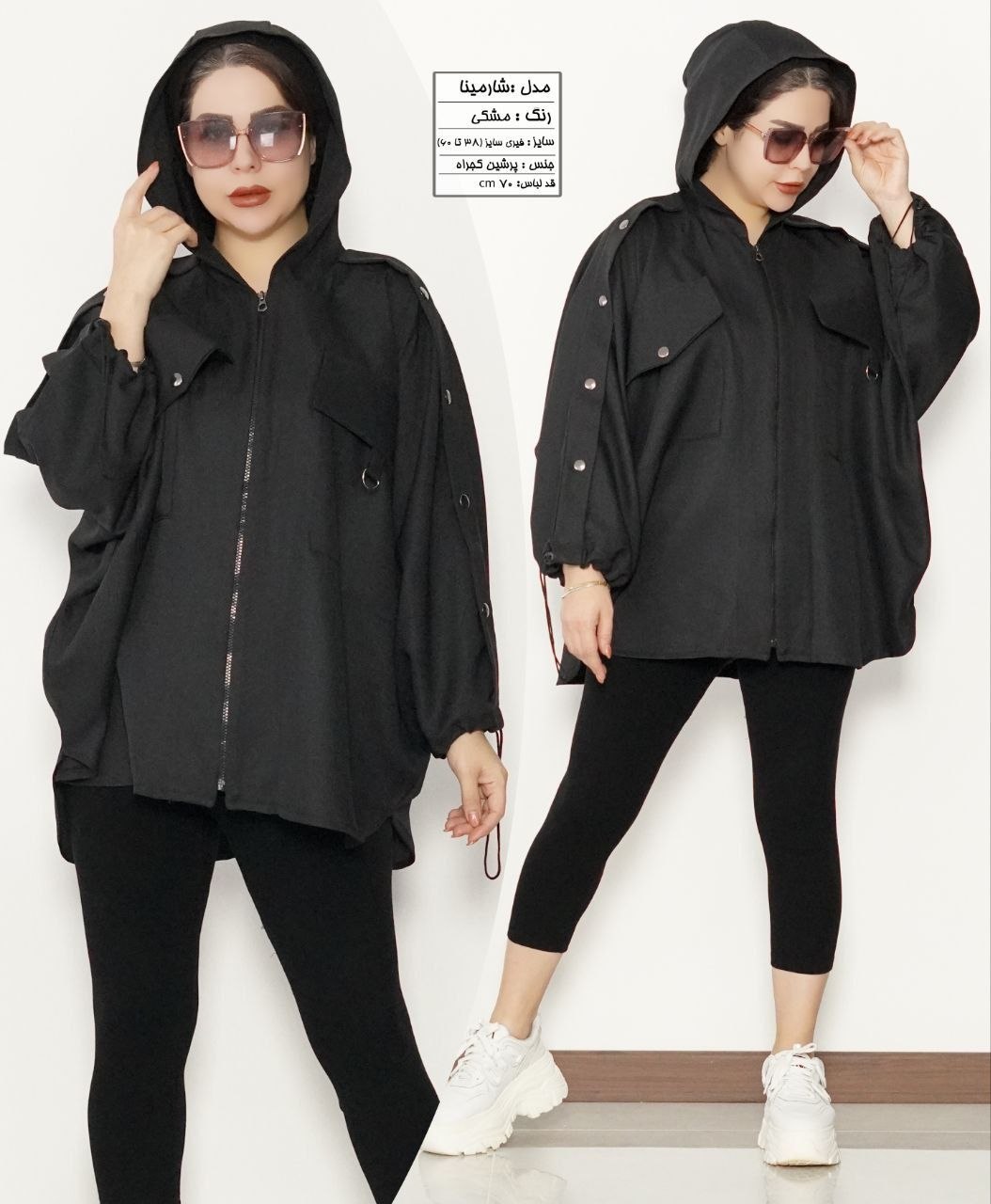 جلوی لباس زیپ دارد . کلاه دارد چسبیده به لباس