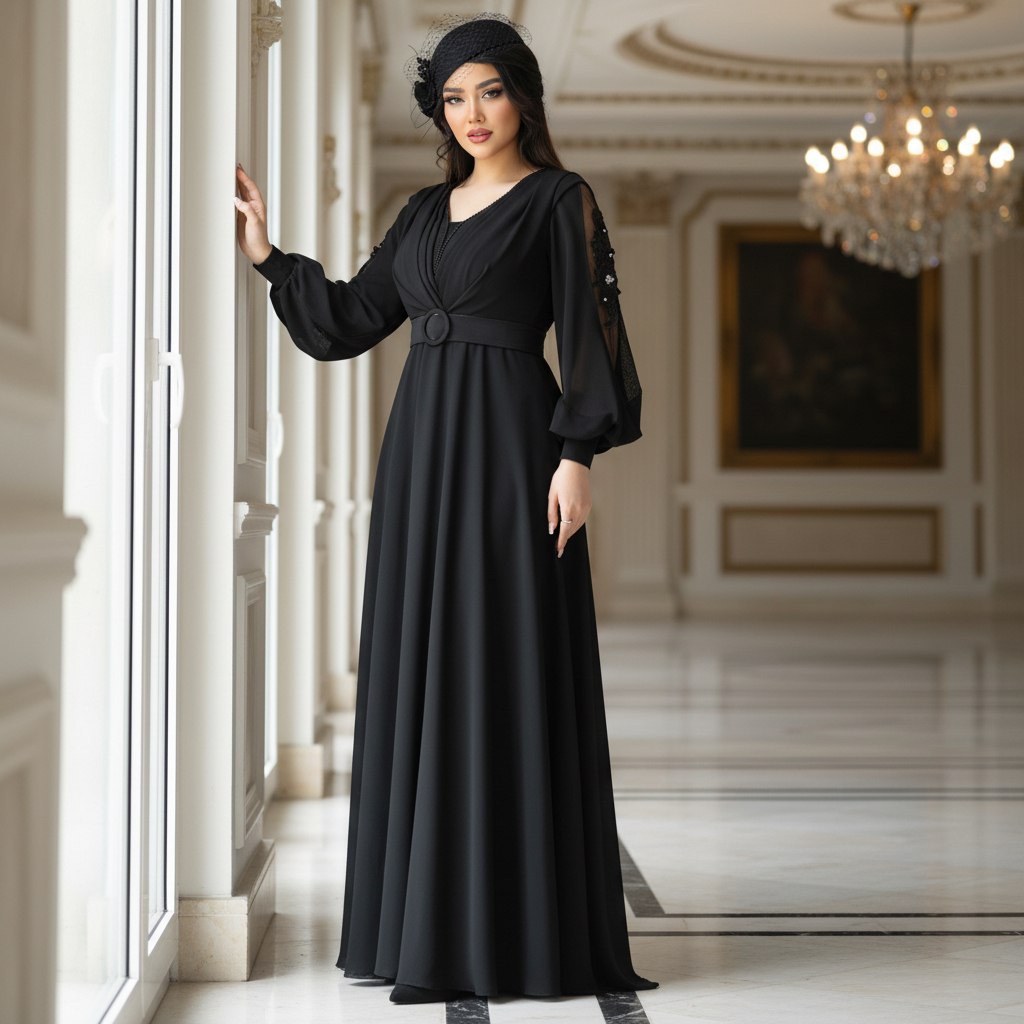 ⚜جنس : کرپ غواصی و استین تور و دانتل برجسته یقه نواردوزی شده با کمربند
