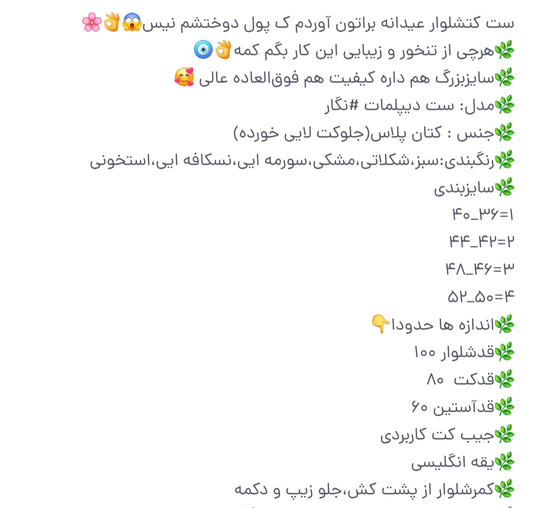 🌿رنگبندی:سبز،شکلاتی،مشکی،سورمه ایی،نسکافه ایی،استخونی،سفیید،قهوه ای سوخته