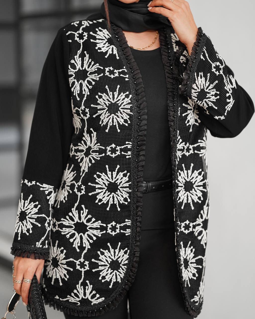 جنس پارچه كرپ لمه جت بلك +خرجكار دانتل + سنگ دوزي +جلو كار لايي پرشين