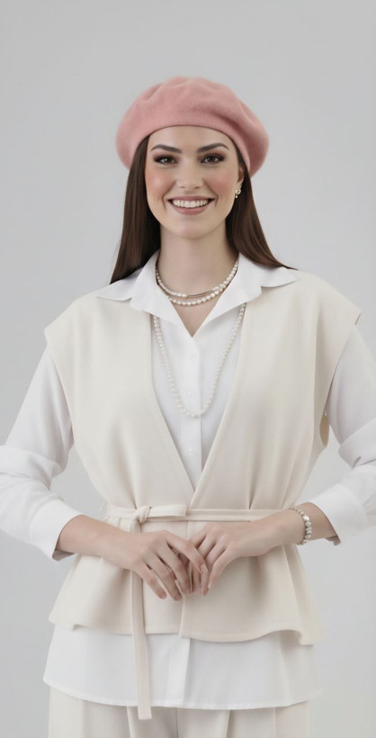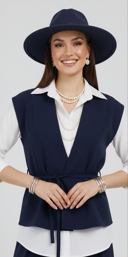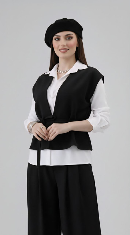 جلیقه: مدل آزاد با کمربند قابل تنظیم، برش تمیز و ایستایی شیک